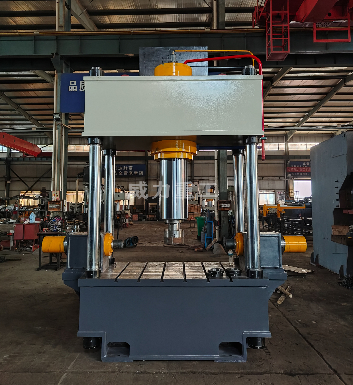 3. 壓制過程:上梁下壓,壓力通過上下模具傳遞到工件上,實現(xiàn)壓制成型、沖孔或剪切等工藝。