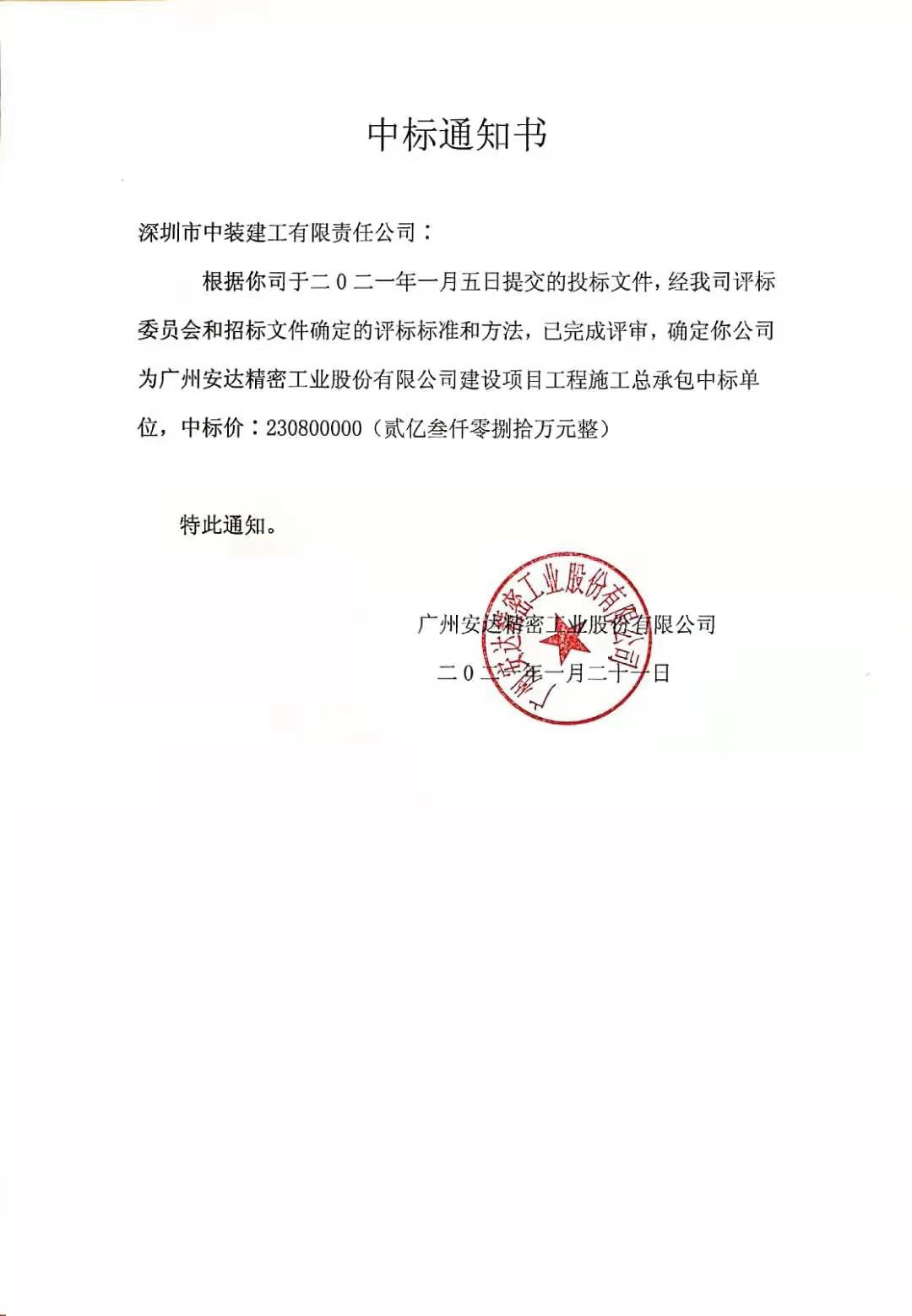 近日,中裝建工中標(biāo)廣州安達(dá)精密工業(yè)股份有限公司建設(shè)項(xiàng)目工程施工承包(以下簡稱“廣州安達(dá)股份施工總承包項(xiàng)目”),中標(biāo)金額為2.3億元。