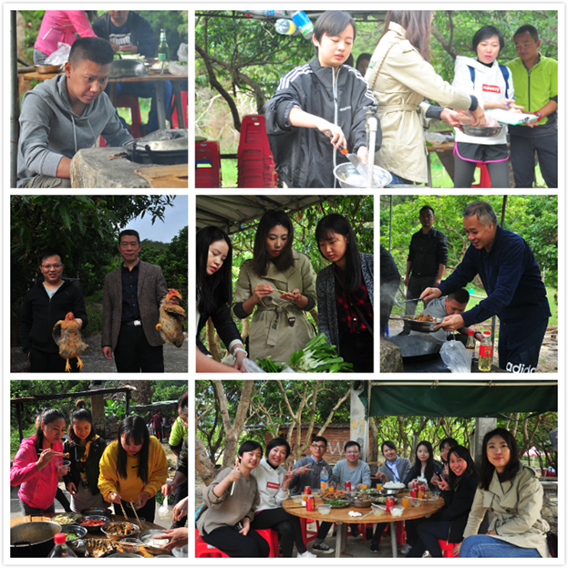 上午十點,隊伍抵達目的地,接受第一項任務考驗——“自助野炊”,以小組為單位,相互合作,就地取材,共同制作美味佳肴。每個組分工不同,有的殺雞、宰魚、摘菜,有的燒柴生火,有的炒菜做飯。每個組菜色也不同,有的北方做法偏辣,有的南方做法偏淡。個個忙的不亦樂乎,經過了大家的辛勤努力,終于品嘗到了各色美食,有的人這桌吃吃,那桌嘗嘗,歡聲笑語不斷。